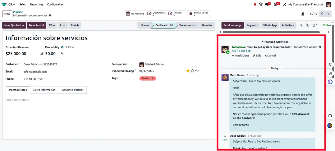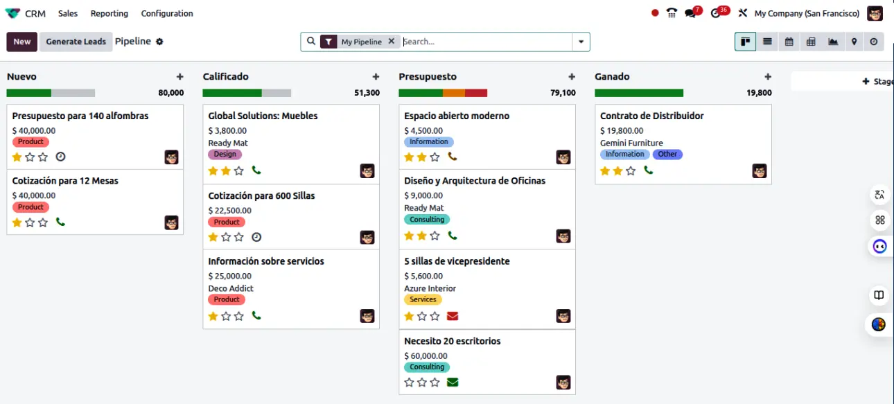 La plataforma CRM de Odoo es una herramienta esencial para la gestión de relaciones con los clientes, permitiéndote priorizar sus necesidades. Facilita el seguimiento de tus leads, proporciona pronósticos precisos y te permite concentrarte en lo fundamental: la conversión de oportunidades en resultados tangibles.