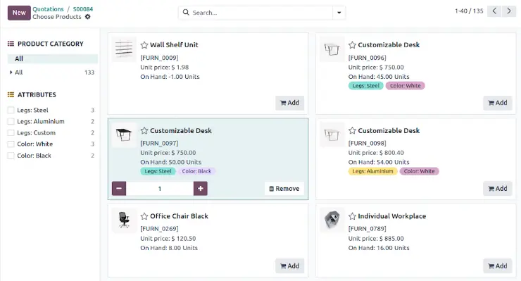 Crea cotizaciones con aspecto profesional en un abrir y cerrar de ojos desde una interfaz fácil de usar. Selecciona los productos de tu catálogo y deja que Odoo se encargue del resto.