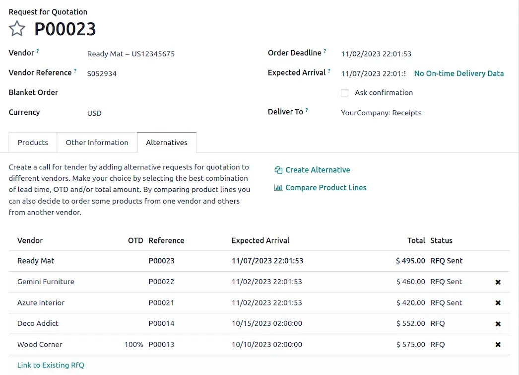 Odoo le permite optimizar el aprovisionamiento con contratos de compra flexibles, solicitudes de cotización inteligentes y órdenes abiertas para operaciones recurrentes.